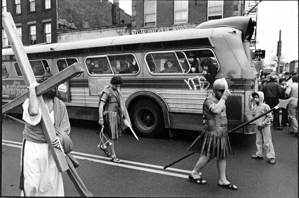 In the 1970’s a group of mostly Puerto Rican parishioners, connected to the growing Catholic Cursillo movement, introduced a livelier more personal liturgy to their Italian-American and Irish-American fellow congregants at St. John the Evangelist Roman Catholic Church on 21st Street, Brooklyn. The highlight of this group’s active devotion was their annual reenactment of the passion and death of Jesus Christ on Good Friday. Dressed as Jesus, Mary, Herod, and other New Testament figures, members of this group, informally known as de Colores, staged the traditional Stations of the Cross on the streets of the parish. Jesus was whipped, fell and met his Mother as hundreds watched. I photographed the first procession which took place in 1974 up until the last in 1981.