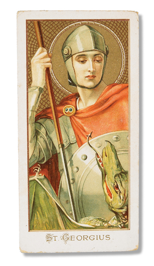 A soldier from Palestine fighting for the Roman army in Libya, George killed a dragon that was eating two townspeople a day. He then rescued the king’s daughter and was given a white banner with a red cross on it, which he used to convert the town. George’s cult was brought back to England during the Crusades, when soldiers reported seeing him on horseback. His banner was adapted for soldier’s uniforms and official seals in England.