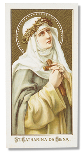 As a young girl, she defied her parents and took up the religious life. A tertiary in the Order of St. Dominic, she tended the incurably ill. Catherine received the stigmata, and she developed a following of young people. Her series of dictated letters are classics of Italian literature. She convinced the Pope to return the Holy See from Avignon, France, to Rome, and this made her the patron of Italy.
