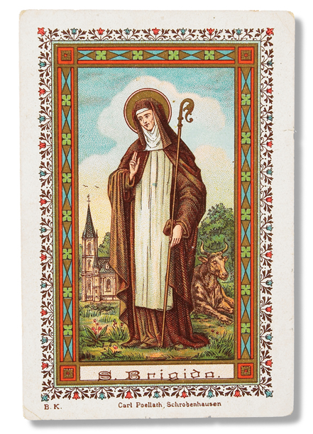 The daughter of a pagan king and a Christian slave, Brigid helped her mother run her owner’s dairy with great success, despite the fact that she gave away more than they sold. After refusing to marry, Brigid entered into religious service and started the great Monastery of Kildare for men and women, which had a world-famous art school. She traveled extensively, founding religious houses throughout Ireland, and is buried with Saints Patrick and Columba.