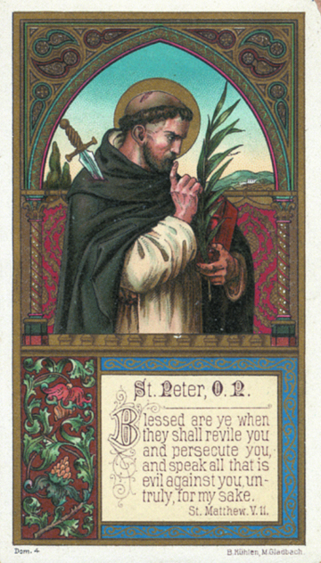 Saint Peter of Verona 1205–1252. Feast Day: April 29. Patron of: Inquisitors.
