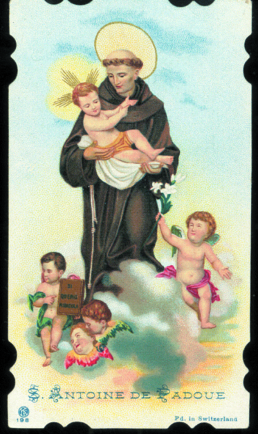 Feast Day: June 13. Patron of: Lost Articles. Those in Debt. Portugal. A Franciscan friar known for his extraordinary preaching ability, he is also known as “The Wonderworker.” He is always shown with the baby Jesus because an uncle once saw Anthony laughing and playing in the garden with an infant who kissed him, then disappeared. The angels hold the psalter that was stolen then returned to Anthony after praying for it.