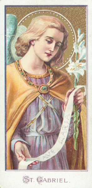 Feast Day: September 29. Patron of: The Communications Industry. Postal Workers. Teachers. Parents. Gabriel is most famous for the Annunciation, when he appeared to the 14-year-old Mary and told her she was to give birth to the Divine Savior. He holds lilies for Mary’s virginity and a proclamation reading, “Ave Maria…” “Hail Mary…”