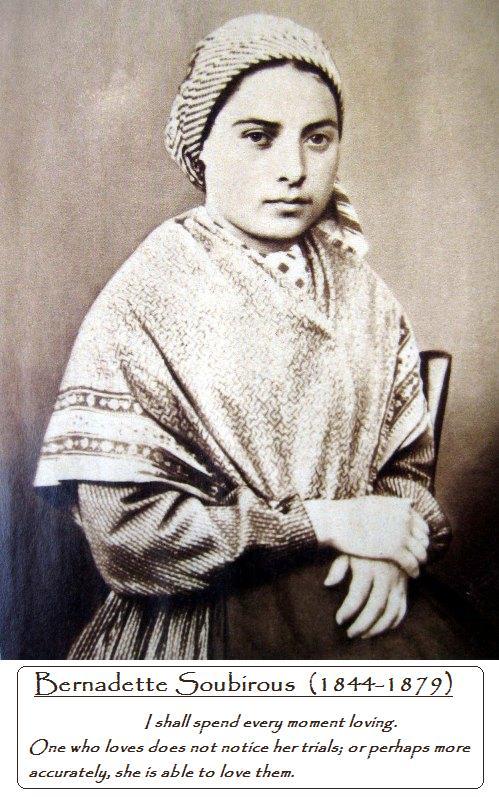 Help, O Dear Saint Bernadette to follow your example, so that irrespective of our own pain and suffering we may always be mindful of the needs of others, especially those whose sufferings are greater than ours.