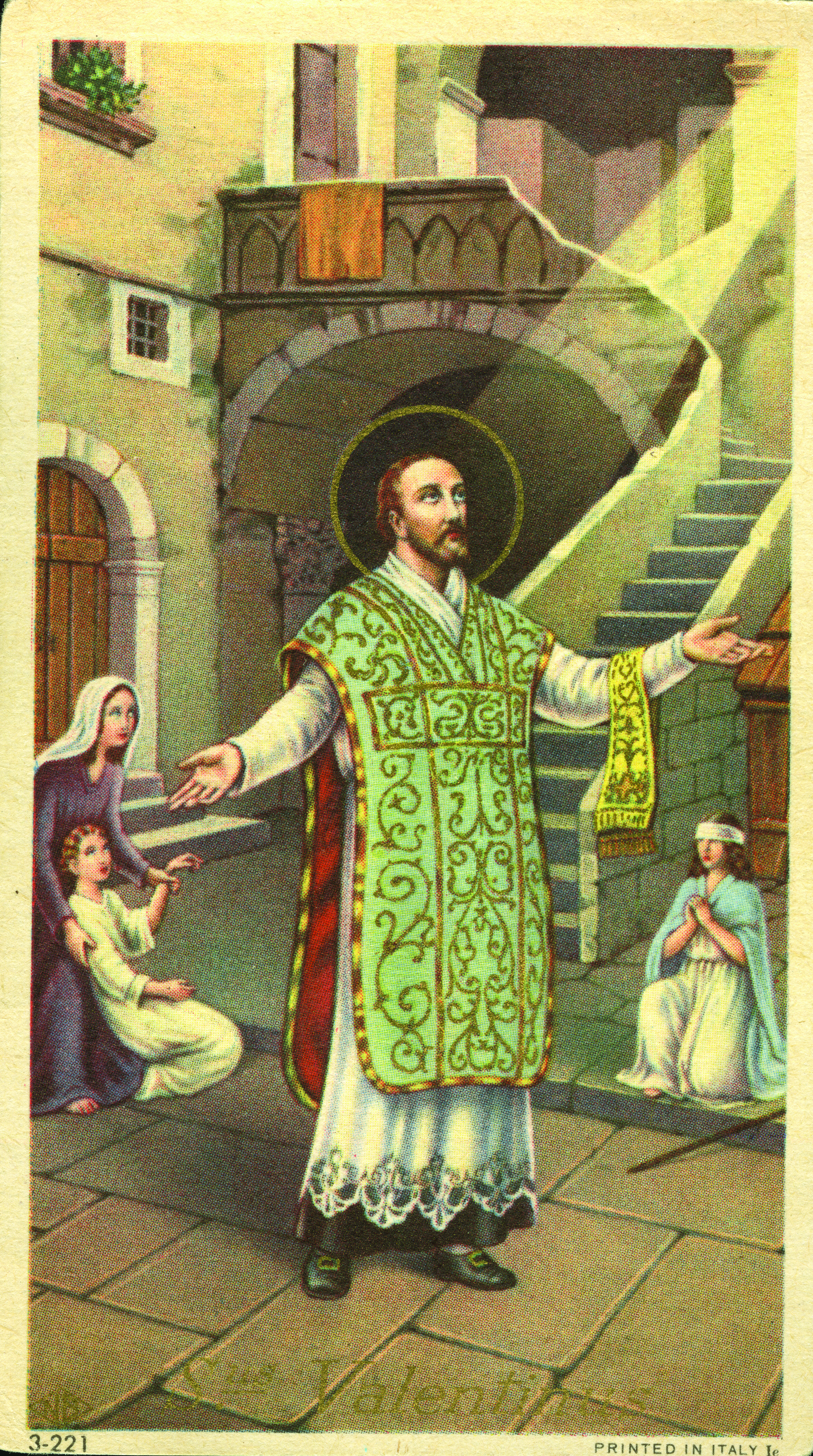O glorious advocate and protector, Saint Valentine, look with pity upon our wants, hear our requests, attend to our prayers, relieve by your intercession the miseries under which we labor, and obtain for us the divine blessing, that we may be found worthy to join you in praising the Almighty for all eternity; through the merits of Our Lord Jesus Christ.