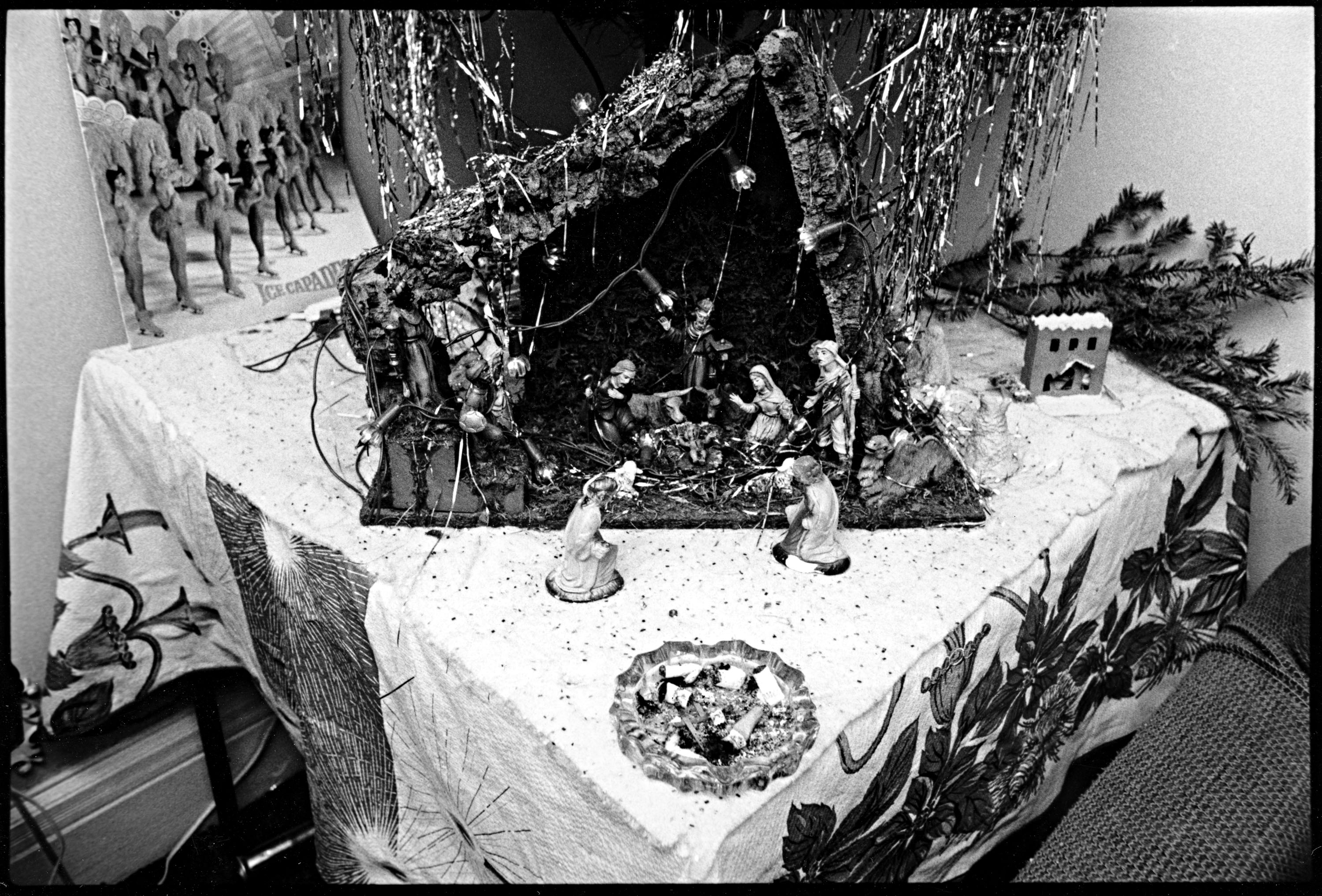 The two b x w photos (above) here are of creches, or as we called them, Nativity sets, that belonged to my nuclear family, and to my Aunt Kitty and Uncle Lucky.